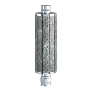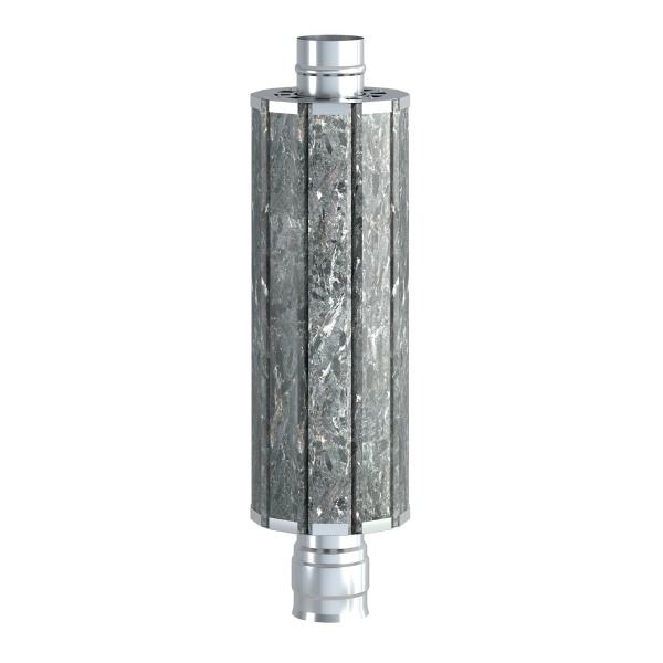 Экономайзер изготовлен из нержавеющей стали толщиной 1 миллиметр, и может быть установлен в качестве замены первого метра дымохода в парной. Конструкция экономайзера предусматривает установку в качестве внешней облицовки десяти ламелей из натурального камня.