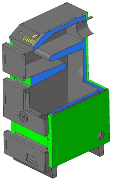 Котел работает как в закрытых так и в открытых системах отопления, выполнен из стали марки 09Г2С толщиной 4 мм. Все стенки и перегородки котла водонаполнены. Котел оснащен большими и удобными дверцами с механизмом затяжки плотности прилегания. Благодаря этому его удобно чистить и обслуживать, уплотнительный шнур используется керамический. Также все котлы оборудованы местом для установки электрического ТЭНа.