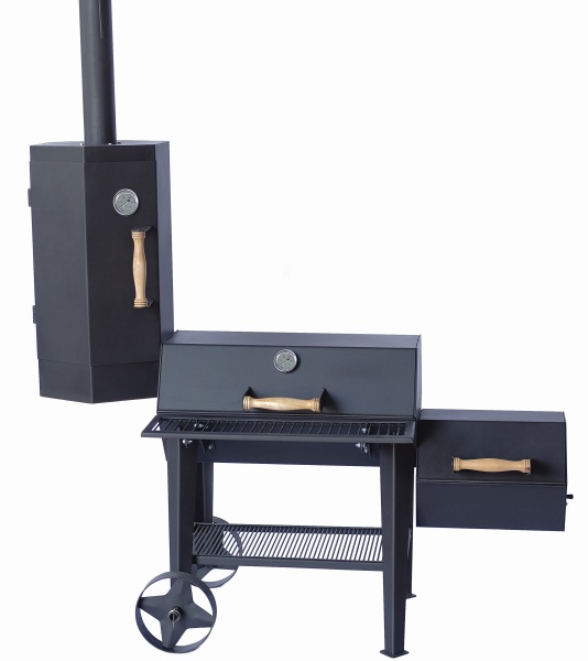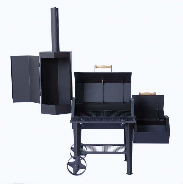 Конструкция сочетает в себе барбекю, гриль, коптильню холодного и горячего копчения − фактически 4 в 1. С виду выглядит как усовершенствованное классическое барбекю.