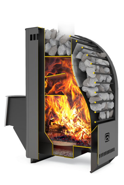 Каменкой с большой поверхностью очень удобно пользоваться даже в небольших парных. Кроме того, такая каменка даёт очень много мягкого тепла от раскалённых камней, что в сочетании с боковыми нагревательными поверхностями создаёт совершенно удивительный микроклимат в парной.