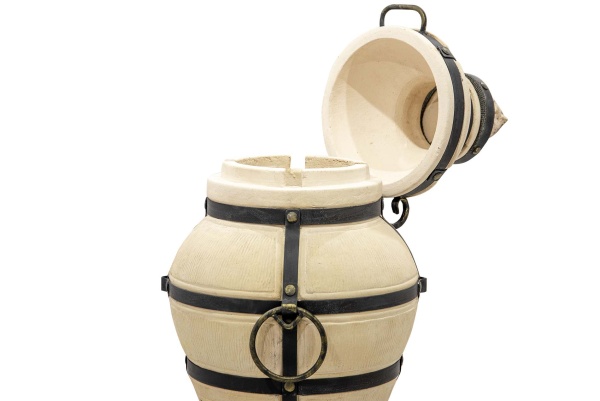 Тандыр "Аполлон" выполнен в виде овального бочонка среднего объёма. Тандыр имеет крышки двух уровней (колпачок и крышку). Удобно выполненный колпачок, позволяет не терять тепло при открывании тандыра. А крышка с удобными ручками позволяет легко открывать тандыр и закладывать в него продукты для приготовления. Кованная подставка - ножки обеспечивает удобное использование тандыра. Красоту тандыру придаёт орнаментальный растительный узор, расположенный в центральной его части. Керамический тандыр в основном выполнен в бежевом цвете, коричневый цвет добавлен в области орнамента. На поверхность орнамента нанесена глазурь, которая защищает его от влаги и грязи. Изготовленный из шамотной глины высокотемпературного обжига он обладает высокой теплопроводностью, экологичностью, прочность и долговечностью более 10 лет.